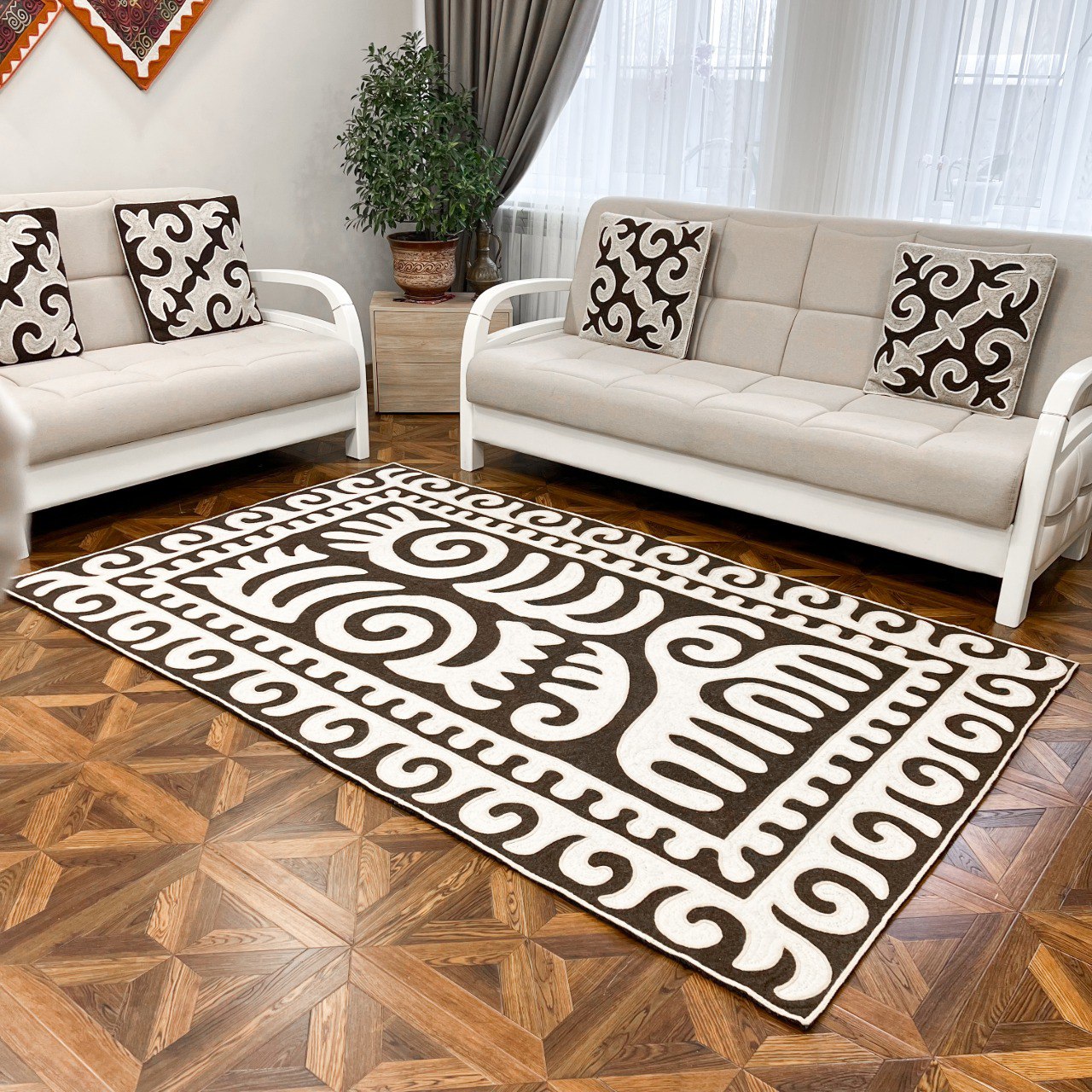 Шырдак «Саймалуу-Таш» получил своё название в честь древних петроглифов Кыргызстана. Его узоры отражают вечные символы и орнаменты, передаваемые из поколения в поколение, и напоминают истории, высеченные в камне много веков назад.